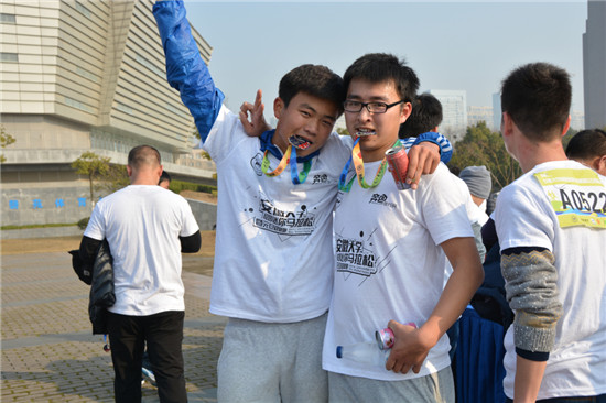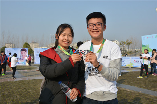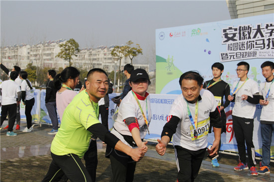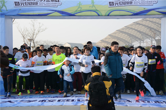 一元复始,万象更新!飞扬的青春需要一场运动来纪念!今天上午,由奔色旅行网和安徽大学校友会、人民网安徽频道联合主办的安徽大学首届校园马拉松暨元旦迎新跑在磬苑校区举行。来自安徽大学的师生员工和历届校友以及合肥市部分市民共计2000余人参加了安徽大学首届校园马拉松,安徽大学党委副书记、校长程桦,安徽大学校友会MBA分会会长王培军、奔色旅行网执行董事张保华、安徽大学校友代表李曜共同为赛事鸣枪。