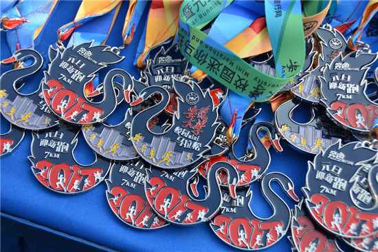 考虑到运动安全,组委会负责人、奔色旅行网总经理朱玉宝决定本次马拉松赛不设赛事门槛,也不设奖。所有参与的运动员,只要完成了比赛,回到终点就会获得一块属于自己的纪念奖牌。这次的奖牌设计也别出心裁,主画面是安徽大学的神鸟——黑天鹅,这一设计获得了众多参与者的喜爱。而对于安徽大学校园马拉松未来的发展规划,朱玉宝说,将在合适的时候引进计时装备,将安大校园马拉松升级成品牌赛事。