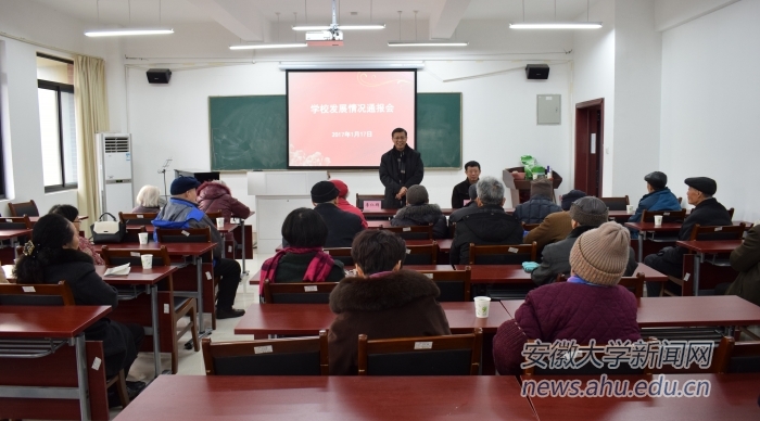 又讯 1月17日上午,学校在龙河校区教工活动中心203会议室召开离退休同志学校情况通报会。校党委书记李仁群代表学校,衷心祝愿各位离退休同志精神愉快、家庭幸福、健康长寿、万事如意,热切期盼各位离退休同志积极关心和支持学校的各项工作,把过去在办学、培育优良教风学风、培养学生等方面的经验进行总结提炼,进一步促进学校优良校风学风的培育,促进学校的改革发展。校党委副书记、纪委书记胡小松主持会议。
