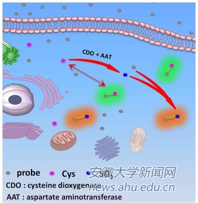 半胱氨酸(Cys)作为一种硫醇类小分子氨基酸,在许多生理、病理过程中扮演着很重要的角色。在细胞代谢过程中,Cys会在半胱氨酸双氧化酶和天冬氨酸氨基转移酶的作用下向SO2和丙酮酸转变。为实现该过程的可视化,研究团队以香豆素为荧光团,引入α,β不饱和双键和醛基分别作为Cys和SO2的识别位点,结合探针分子对Cys响应的可逆性,首次在细胞水平实现了荧光探针对Cys细胞内代谢过程的荧光成像。该工作拓展了小分子氨基酸荧光探针的应用前景,为细胞内氨基酸代谢途径研究提供了新思路。