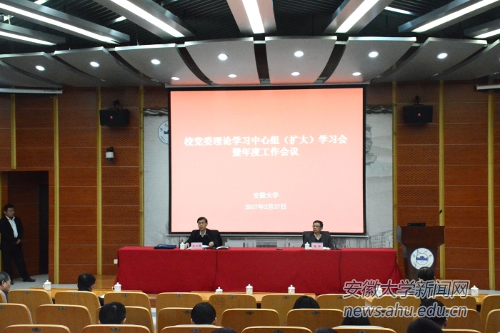 本网讯(新闻中心 李贤)2月27日下午,校党委理论学习中心组(扩大)学习会暨年度工作会议在文典阁报告厅召开。会议传达学习省委有关会议精神,部署我校贯彻落实举措。校党委书记李仁群主持会议,校长程桦对2016年工作进行总结并部署2017年工作。校领导胡小松、虞宝桃、俞本立、薛照明出席会议。