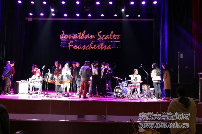 乔纳森乐队通过“美国音乐在海外”这个民间文化交流项目来到安徽大学,将丰富多彩的美国音乐文化呈现给中国师生。带着音乐去环游世界,让世界听到他们的声音,这是他们乐队的梦想。他们也对安大的学生说:“要拥有构想未来的图景,拥有自己清晰的目标,抓住实现目标的机会!”