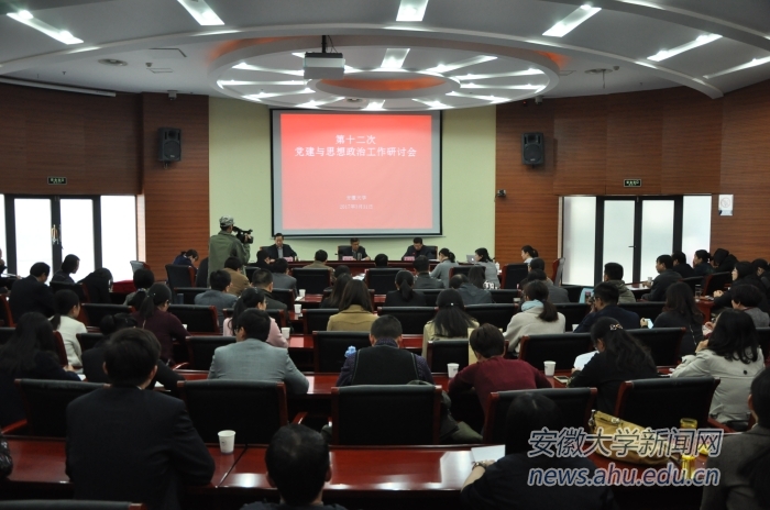本网讯(新闻中心 李贤 学生记者 张艺凡)3月31日下午,学校在磬苑校区办公楼B204会议室,召开第十二次党建与思想政治工作研讨会。校党委书记李仁群出席会议并讲话,校党委副书记、纪委书记胡小松主持会议,副校长薛照明宣读《关于表彰2016年度贯彻执行<安徽大学新闻宣传工作积分制度>先进单位和先进个人的通知》和《关于表彰第十二次党建与思想政治工作研讨会优秀调研报告和论文的决定》。