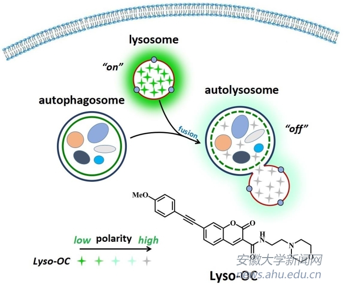 细胞自噬是一种非常重要的细胞代谢途径,在肿瘤、帕金森等疾病过程中扮演了重要角色。传统的自噬监测方法大都从生物的角度出发,通过监测在自噬过程中特定蛋白的表达或者观察亚细胞器的形态实现,操作方法复杂而且难以在活细胞内实现高效监测。在细胞自噬过程中,自噬体(autophagosome)与溶酶体(lysosome)发生融合, 由于自噬体和溶酶体内极性的显著差异而导致在膜融合过程中,溶酶体的极性会发生变化。基于此,研究团队以“溶剂致变色”荧光团香豆素为母体,设计了一种溶酶体定位的小分子双光子荧光探针,实现了溶酶体极性变化的高灵敏度实时原位检测,并以此为基础构建了通过检测自噬过程中溶酶体极性变化来实现对活细胞自噬的高效荧光监测。该工作从化学角度出发,为监测细胞自噬过程提供了一种新思路。