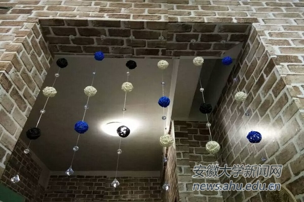 除了门面,在寝室内部的装饰上同学们也下尽了苦功。松园1110寝室的墙面彻底“改头换面”,贴上了褐色砖型墙纸。这三个心灵手巧的姑娘还极具创意地在寝室中央拼装了一个小茶几,搭配着蓝白相间的门帘,相当雅致。“我们寝室的装修主题就是古典雅致。”1110寝室的成员赵秋实显然对她们的劳动成果感到满意,“为了体现专业的特色,我们把墙面设计成了古堡风格,墙面上用麻绳与树枝装饰,这样看上去古朴又简约。”提到寝室中央的小茶几,赵秋实很是兴奋:“我们寝室的成员都喜欢品茶嘛,放置一个茶几的话,大家有时间可以聚在一起品品茶,聊聊天,围坐在一起看书也是好的。”如此彻底的装修也着实花了她们好大的工夫:“高处的墙纸是我们寝室的‘小太阳’踩着两个凳子上去贴的,非常勇敢。在装修的过程中我们经常一起忙碌到深夜,这也增进了寝室之间感情。最开心的还是在装修后,住在寝室里感觉温馨了很多。”