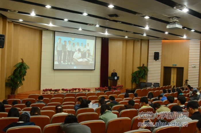 他介绍了新疆生产建设兵团以及自己所在的博士服务团,通过短片让同学们直观地了解博士服务团的工作职责。作为中组部和团中央组织的第十六批、安徽省首批博士服务团成员,宋吉明在新疆昆仑神农股份有限公司挂职锻炼,他带领企业技术人员,攻坚克难,提出并完成“同步提取甘草有效成分”项目,为企业带来大量的技术储备,创造了很好的经济效益。