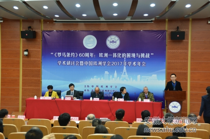 本次会议由中国欧洲学会主办,南京大学欧洲研究中心和安徽大学欧盟研究中心承办。会议期间,来自安徽大学、中国社会科学院、中国人民大学、中国政法大学、复旦大学、南京大学、四川大学、山东大学、中国国际问题研究院、上海社会科学院、安徽省社会科学院等高校和科研机构的专家学者,还围绕“英国脱欧与欧洲一体化的未来”、“中欧经贸合作及外交关系”、“法德核心与欧洲一体化”、“欧洲难民危机和民粹思潮的复兴”、“欧洲联盟的双边与多边外交”和“欧洲社会发展专题”等主题举行了分组讨论。