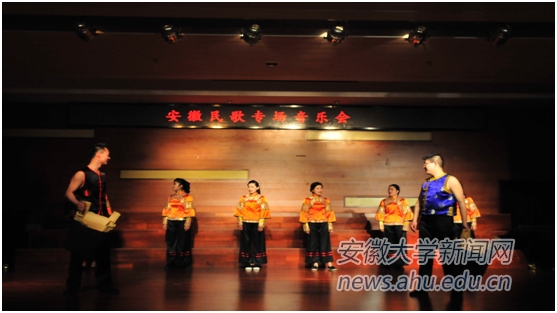 在安徽民歌专场音乐会上,号子、山歌、舞歌、秧歌和小调5个板块依次演出。音乐系在音乐会形式上首次采用无伴奏一领众合的演唱方式演绎了号子这种伴随劳动而歌唱的汉族民歌演唱形式。《小小夯来四方方》、《打一锤来哼一声》和《郎跟乖姐打麦场》表现出劳动人民的淳朴、智慧和力量。参加表演的同学还在舞蹈老师的指导下加入了以简单民俗劳作动作为基础的集体舞蹈。舞歌《凤阳花鼓》幽默风趣,演唱者的大胆滑稽表演,引得观众开怀大笑。《摘石榴》、《姑嫂对花》、《牛歌》等民歌对唱,让音乐会演唱形式丰富多彩。