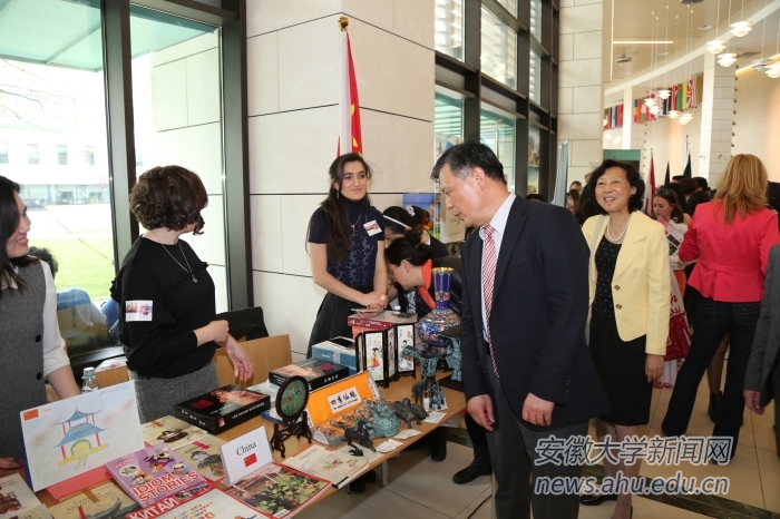 阿塞拜疆外交大学是与巴库国立大学孔子学院密切合作的一所高校。中国展台上精美的青铜摆设、内画壶、双面绣屏风和瓷器等中国特色工艺品吸引了大批师生驻足良久,还有不少参与活动的其他国家代表也前来参观。展台上摆放着关于京剧、中国饮食、中国建筑、汉语学习等方面的宣传书籍与画册,也颇受大家欢迎。由孔子学院教师和在外交大学学习汉语的阿塞拜疆学生合作表演的中国舞狮节目,展现了中国文化热闹喜庆的一面,随着两只“狮子”摇首摆尾地绕场一周,演出厅内出现了一个热闹的小高潮。