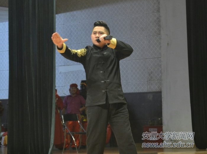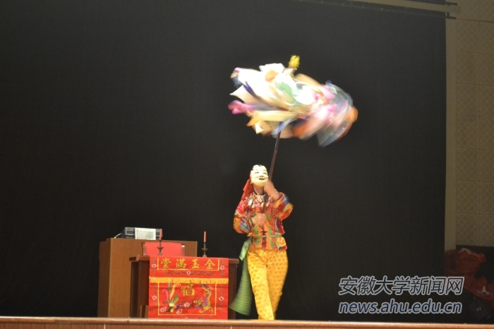 本网讯(新闻中心通讯员 刘晓健)4月26日下午,由安徽大学教务处主办、安徽大学艺术学院民俗艺术研究中心承办的“假面真声”国家级“非遗”贵池傩、中华口技展演和教学活动,在磬苑校区艺术楼小剧场举行。 本次展演活动是民俗文化进校园的第五次活动,以艺术学院民俗艺术研究中心主任程波涛博士主讲,他结合傩戏的源流、表演方式、傩戏的仪式特点、民俗主题和功能等,对傩文化进行了多层次阐释,还针对中华口技的起源、传承和代表曲目等进行了画龙点睛式的讲解与诠释。本次活动秉承前四次活动的原则,将贵池傩与中华口技引入安大,为师生带来了一次生动精彩的民俗艺术体验之旅。