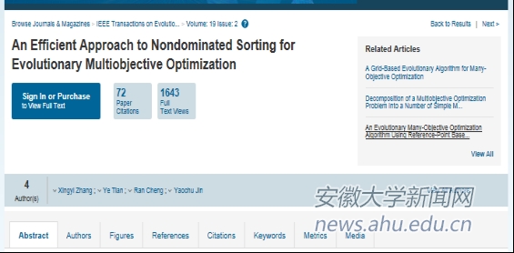 本网讯(刘晓靖)日前,计算机科学与技术学院张兴义教授及其博士生田野,与英国萨里大学金耀初教授和程然博士合作的论文《An efficient approach to non-dominated sorting for evolutionary multi-objective optimization. IEEE Transactions on Evolutionary Computation, 19(2):201-213, 2015.》获得2017年唯一的“IEEE Transactions on Evolutionary Computation Outstanding Paper Award”,成为自1999年设立此奖项以来最早获此殊荣的以中国学术机构为作者单位的科研人员,该奖项将在巴西举行的WCCI 2018上颁奖。