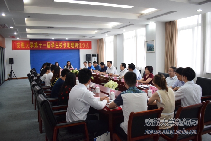 本网讯(新闻中心 杨王颖 苏诗洋)6月21日下午,安徽大学第十一届学生校长助理聘任仪式在磬苑校区办公楼B202会议室举行。校长匡光力为7名同学颁发第十一届学生校长助理证书。这7名同学分别是:商学院2014级本科生李俊杰(连任)、资源与环境工程学院2014级本科生汪晨旭、文学院2014级本科生刘耕晨、化学化工学院2015级本科生陈天雨、社会与政治学院2015级本科生王秀文、数学科学学院2015级研究生唐徐飞和马克思主义学院2016级研究生李艳。