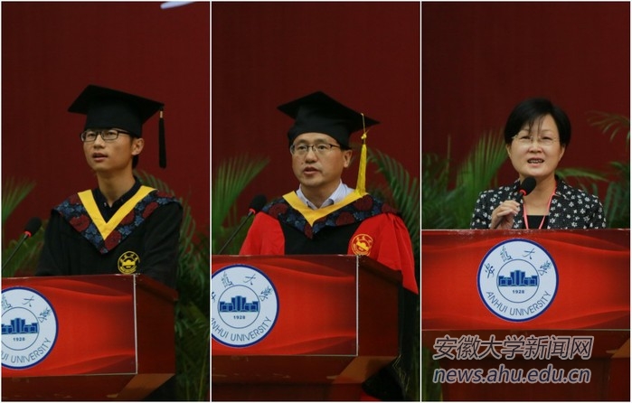 毕业生代表蒋琦、教师代表朱满洲和家长代表梁红群在毕业典礼上发言