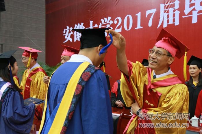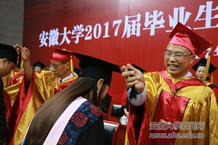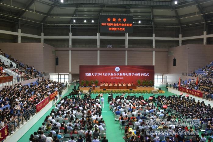本网讯(新闻中心 杨王颖 周丽 常珂欣)6月25日上午,安徽大学2017届毕业生毕业典礼暨学位授予仪式在磬苑体育馆隆重举行。校党委书记李仁群,校长匡光力,党委副书记、常务副校长王群京,党委副书记、纪委书记胡小松,副校长俞本立,副校长薛照明,副校长程雁雷出席并在主席台前排就坐,校学位委员会成员在主席台就坐。王群京主持毕业典礼暨学位授予仪式。
