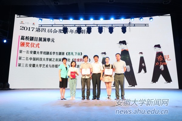 在安徽戏剧网上线仪式上,还同期举行了第四届合肥青年戏剧节闭幕式,副校长程雁雷应邀为本届戏剧节高校剧目展演单元第一名作品——安徽大学戏剧系原创话剧《思凡·下山》颁奖。