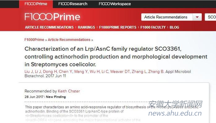 本网讯(新闻中心通讯员 施春霖)我校健康科学研究院近期发表的《Characterization of an Lrp/AsnC family regulator SCO3361, controlling actinorhodin production and morphological development in Streptomyces coelicolor》论文,于6月28日获得英国皇家科学院院院士Keith F. Chater教授推荐,作为世界学术组织F1000Prime推荐论文。我校健康科学研究院博士研究生刘静为第一作者,张部昌教授和张立新讲席教授为共同通讯作者,安徽大学为第一署名单位。