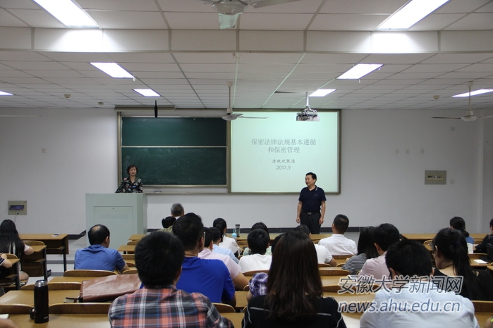 本网讯(新闻中心 柏煦涵)9月20日下午,省国家保密局法规处处长张洁在磬苑校区行知楼B206室,为我校各单位涉密人员、专(兼)职保密员和新进教职工作题为《保密法律法规基本遵循和保密管理》的专题讲座。讲座由学校办公室主任汪向东主持。本次讲座旨在增强我校涉密人员和新进教职工的保密法治观念,掌握保密管理基本知识。