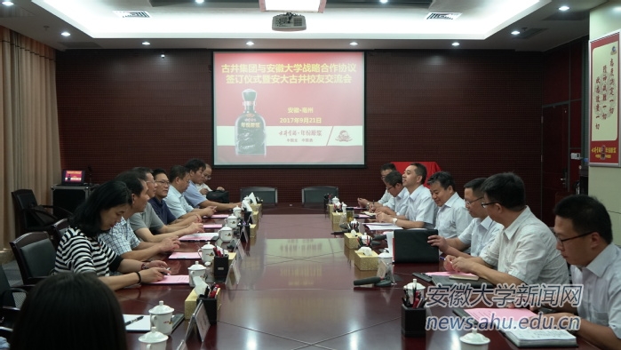 胡小松感谢古井集团对安大校友的关心和关爱。他说,安徽大学目前有118名毕业生在古井集团工作,他们在各自的岗位上都展现出了安大人的风采,希望各位校友秉持“至诚至坚,博学笃行”的校训精神,为古井集团的发展作出更多贡献。在谈到双方合作时,胡小松表示,安徽大学与古井集团合作空间广阔,希望双方建立人才交流的长效机制,深化校企合作,加强产学研融合。