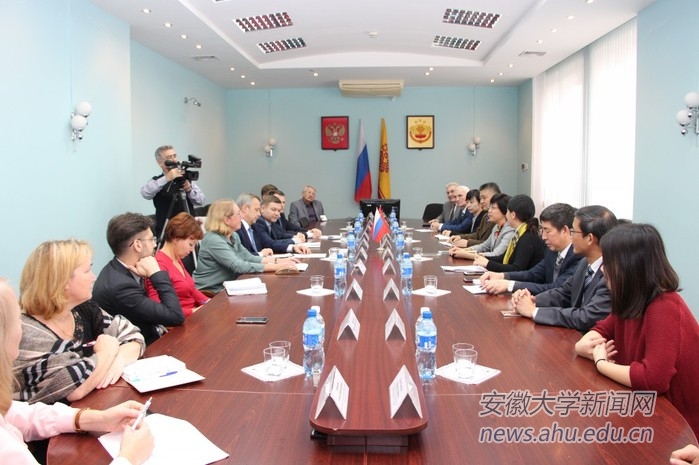 在楚瓦什国立大学,程雁雷与该校校长安德烈·亚历山德罗夫、副校长伊格里·巴维里诺夫及相关部门院系代表进行了会晤,双方就中华文化及汉语推广、研究生联合培训、“双文凭”合作项目、生命科学、生物医学、历史等专业的科研合作、中俄历史学术论坛的举办等内容进行了详细商谈。楚瓦什国立大学对我校的学生质量、办学成果和工作成效予以高度评价,希望在已有合作基础上不断探索新的合作方式。代表团还前往该校相关院系洽谈合作,并出席了第七届阿尔赛季耶夫斯基“大学历史和展望研究学”国际研讨会暨楚瓦什国立大学50周年校庆活动,程雁雷代表安徽大学在会上作了主题发言和报告,并致以贺词。