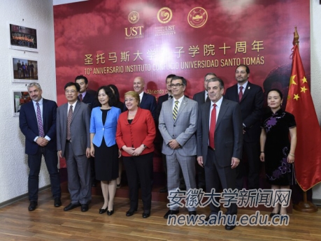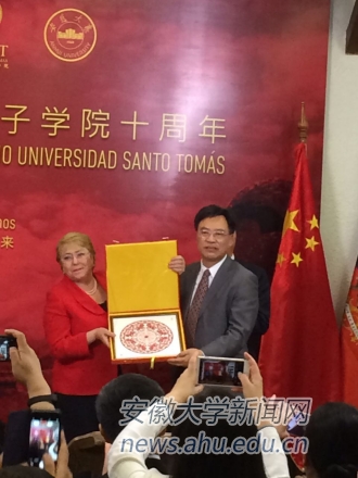 本网讯(文字 姜红 韩斌,图片 胡学文)当地时间11月21日中午,圣托马斯大学孔子学院十周年庆典在拉美中心举行。智利总统巴切莱特、前总统弗雷、文化部长奥通、圣托马斯大学总校长瓦特和中国国家汉办副主任静炜、安徽大学校长匡光力出席。