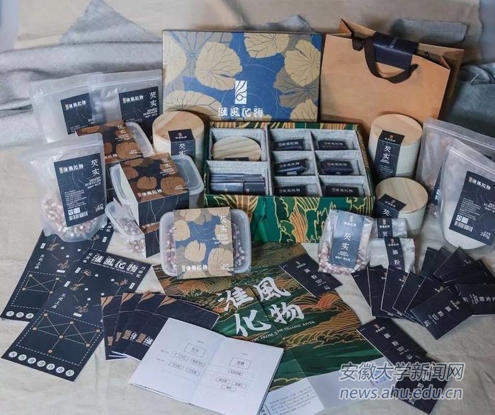 好的物产需要有好的产品形象、品牌形象、包装形式、传播策略、营销思路等作为支撑。艺术学院组织了一支专门服务于“阜南王化物产”项目的设计团队,他们亲自到实地调研、访谈、梳理信息,经过草图手绘、实物模型制作等环节,将芡实、莲藕、红贡米等农产品推向品牌化之路。“淮风化物”小组和“沧田拾珠”小组分别以芡实与莲藕的入药功效为切入点,结合水塘、扁舟采实、掘藕等意象,为自拟品牌设计了产品包装和品牌logo等。