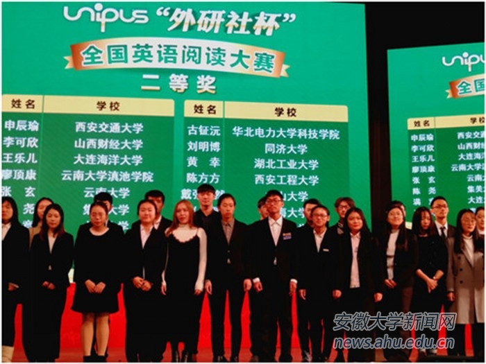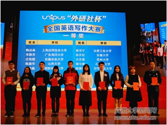 本网讯(新闻中心通讯员 卜兴华)日前,2017“外研社杯”Uchallenge大学生英语挑战赛在北京落下帷幕。外语学院2014级英语专业学生孙开纪在英语写作大赛中荣获一等奖,2015级英语专业学生胡逸在英语阅读大赛中荣获二等奖,写作指导老师詹全旺与和阅读指导老师朱蕴轶荣获优秀指导老师奖。