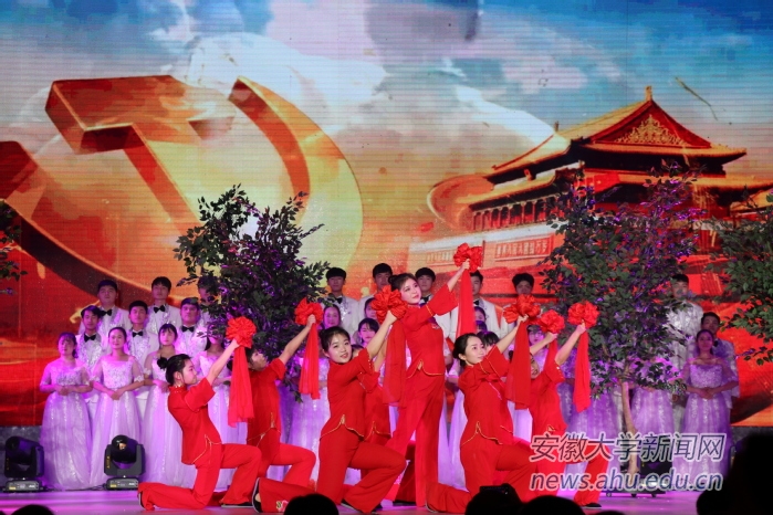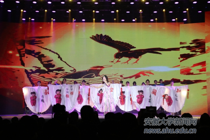 晚会的演员包括离退休教工、在职教工、在校学生、留学生和附属学校小学生,展现了安大一家亲的浓浓情意。“书香伴我走,书中最风流。中华好儿女,书香满神州。”一曲《书香满中华》唱出风声雨声读书声中的家国情怀;《家风代代传》,嘹亮的歌声中演绎“知礼仪”、“孝当先”、“和为贵”等中华传统美德;歌曲《牢记使命》唱出了安大学子不忘初心、继续奋斗的雄心壮志;一曲《我宣誓》,将入党誓词用歌声精美诠释,唱出了安大师生永远跟党走的坚定信心。