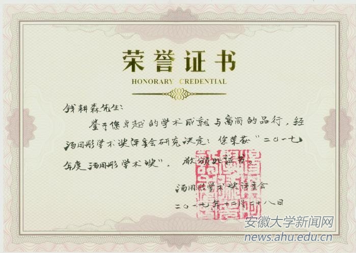 本网讯(新闻中心)2017年度汤用彤学术奖颁奖仪式日前在北京举行。我校哲学系教授钱耕森获奖,并在颁奖现场发表获奖感言。