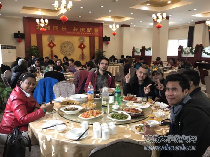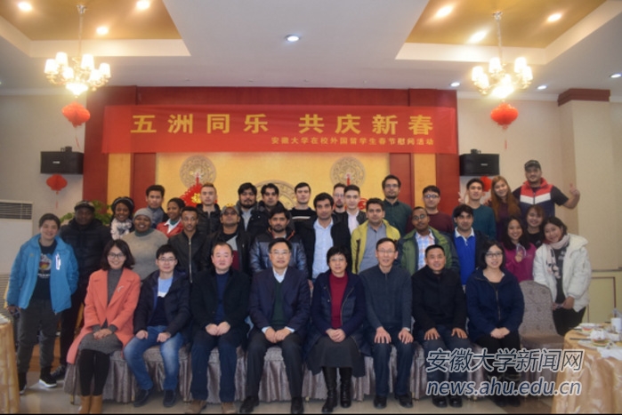 匡光力询问了留学生们假期的学习和生活情况,介绍了安徽大学的历史与发展现状、中国的春节民俗与文化,并向他们致以新年的祝福。留学生们纷纷表示很荣幸能同校长见面,并对学校的关心表示由衷的感谢。活动结束时,校领导与留学生们合影留念。