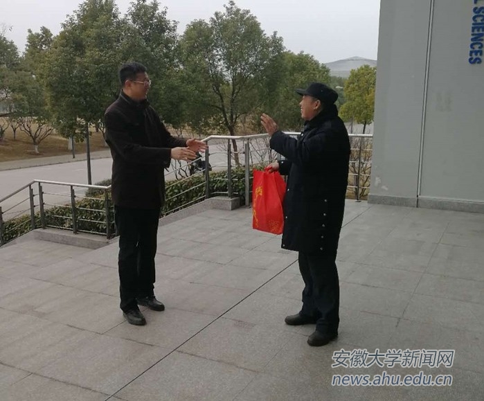 校党委副书记、纪委书记胡小松(左)在磬苑校区慰问节日期间坚守岗位的干部职工