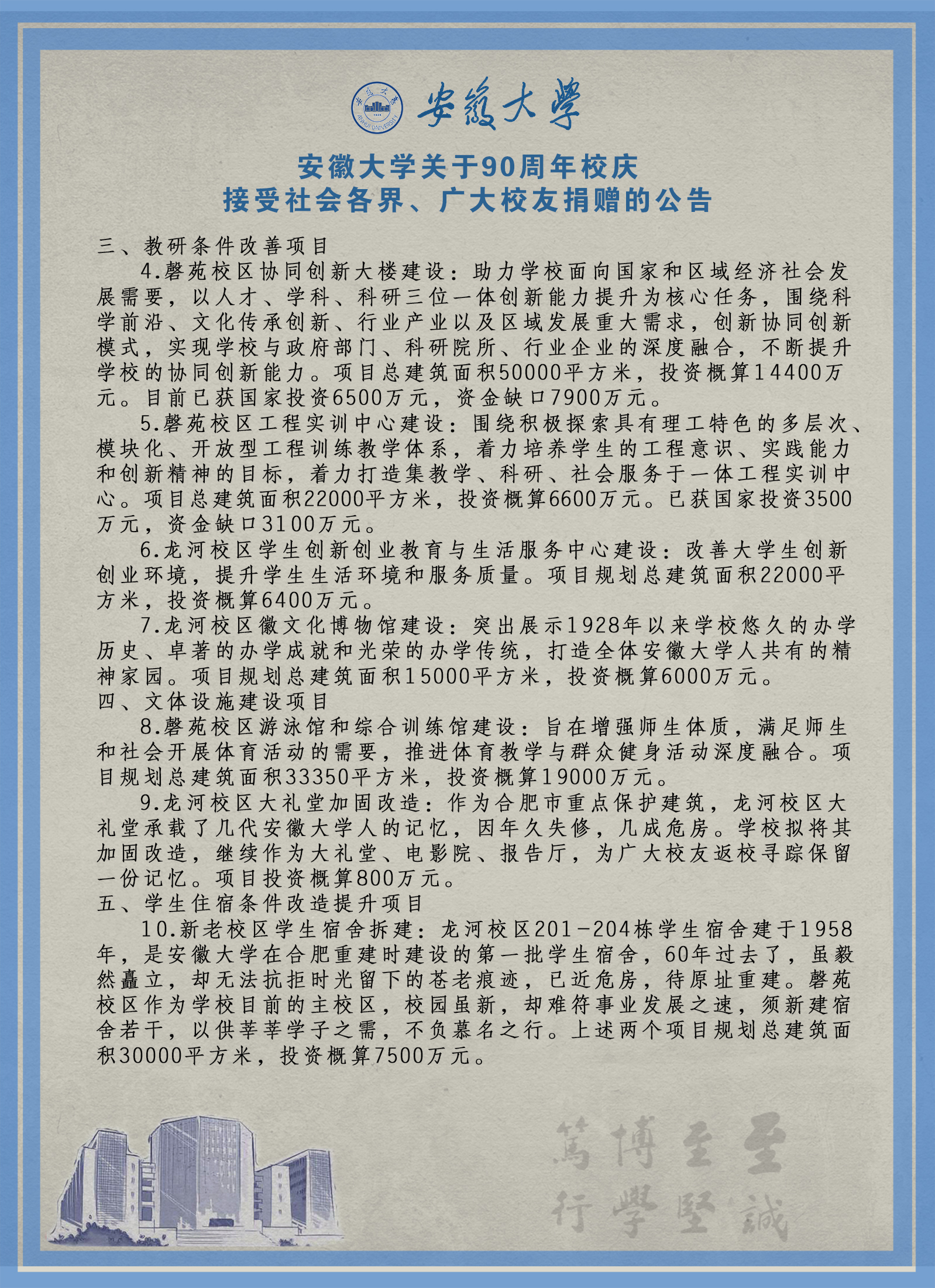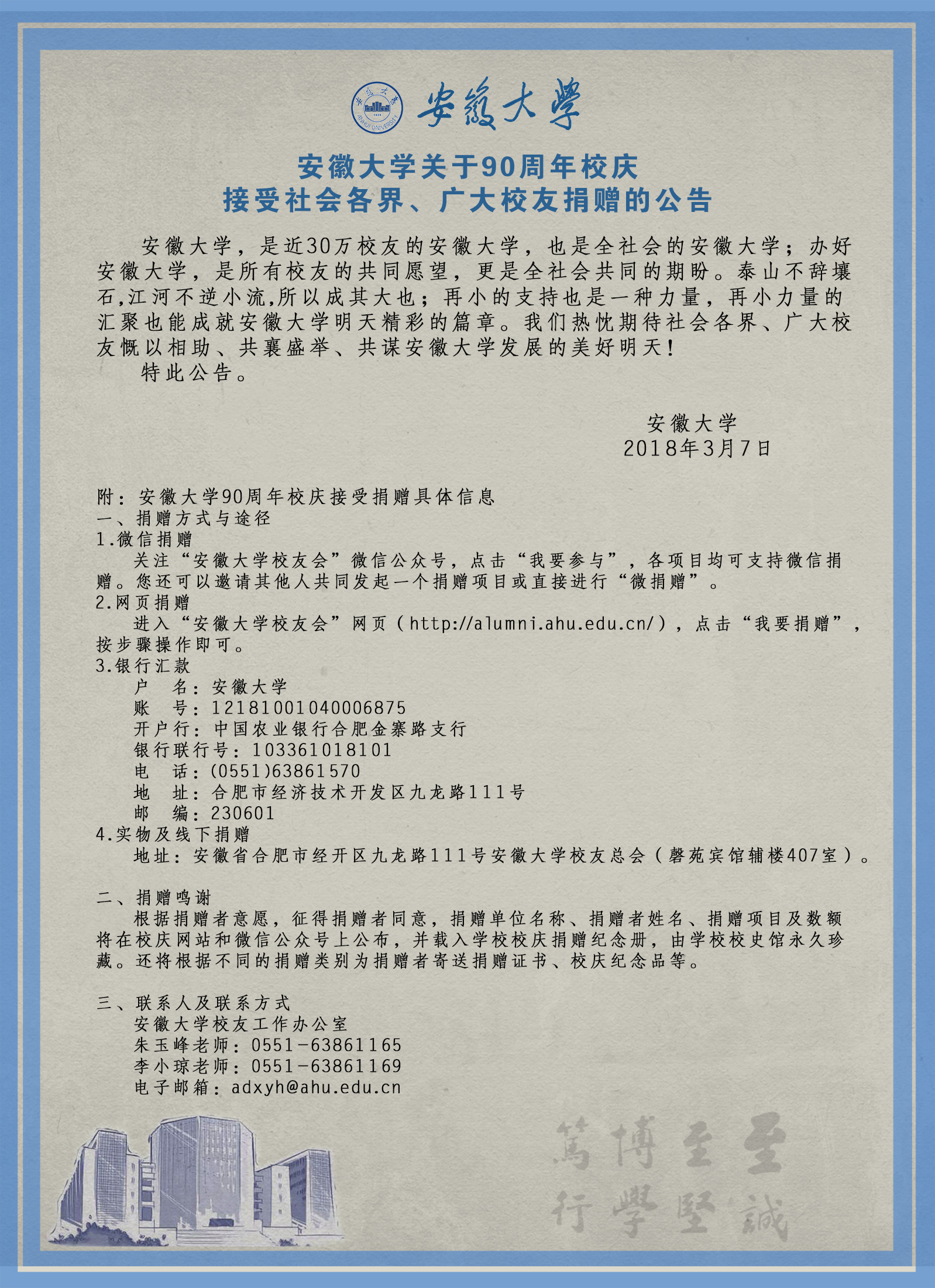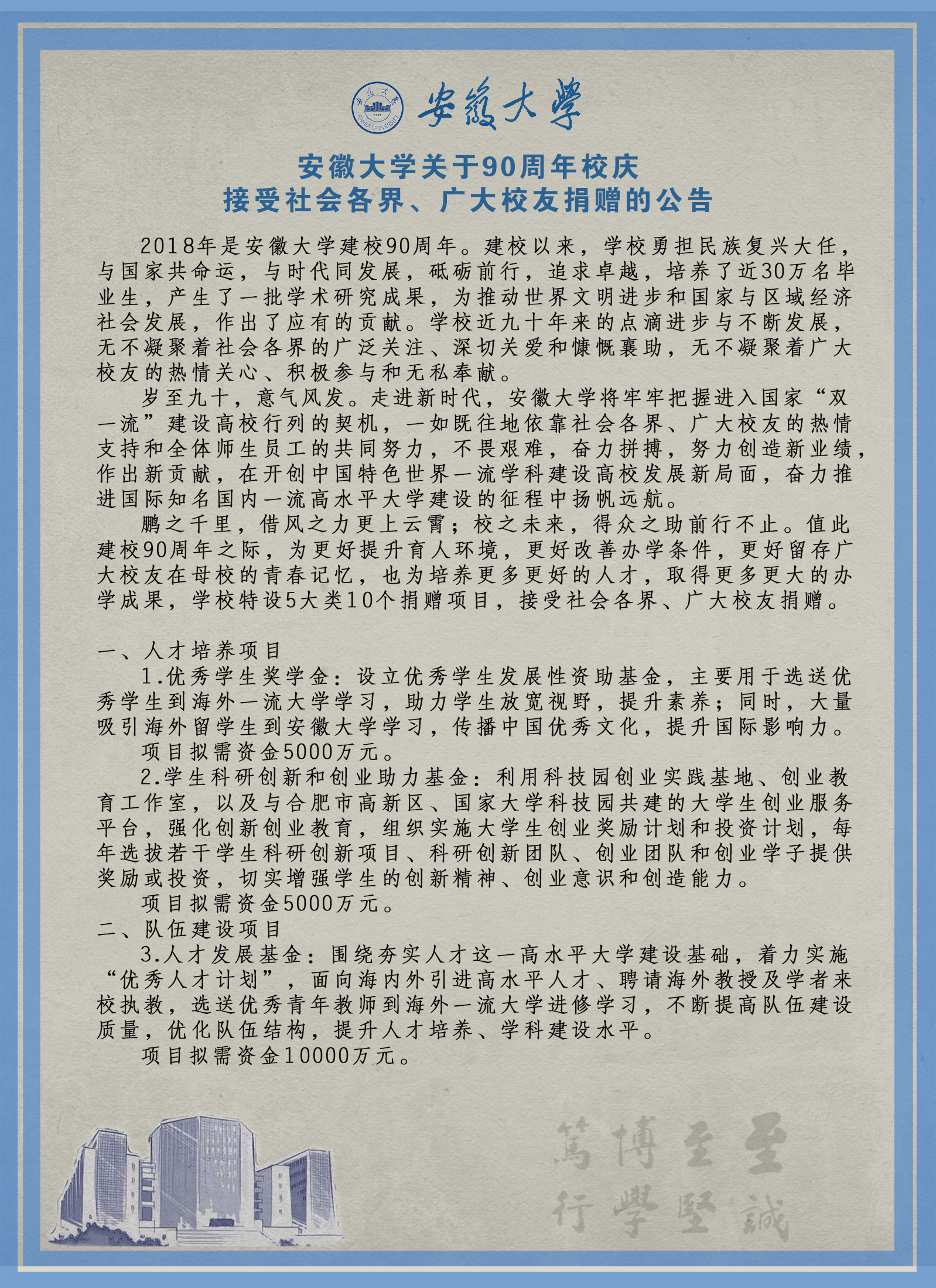 安徽大学关于90周年校庆接受社会各界、广大校友捐赠的公告