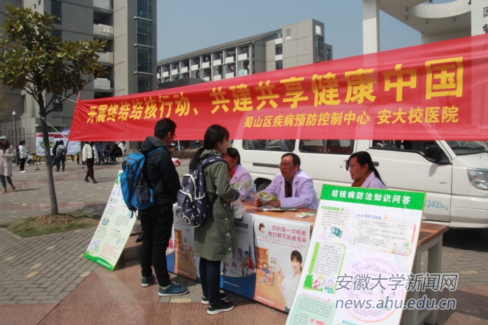 本网讯(新闻中心 姚家宁)今天是第23个世界防治结核病日,活动主题为“开展终结结核行动,共建共享健康中国。”3月23日,安徽大学医院联合蜀山区疾病预防控制中心在磬苑校区榴园餐厅门前开展结核病防治宣传教育活动。