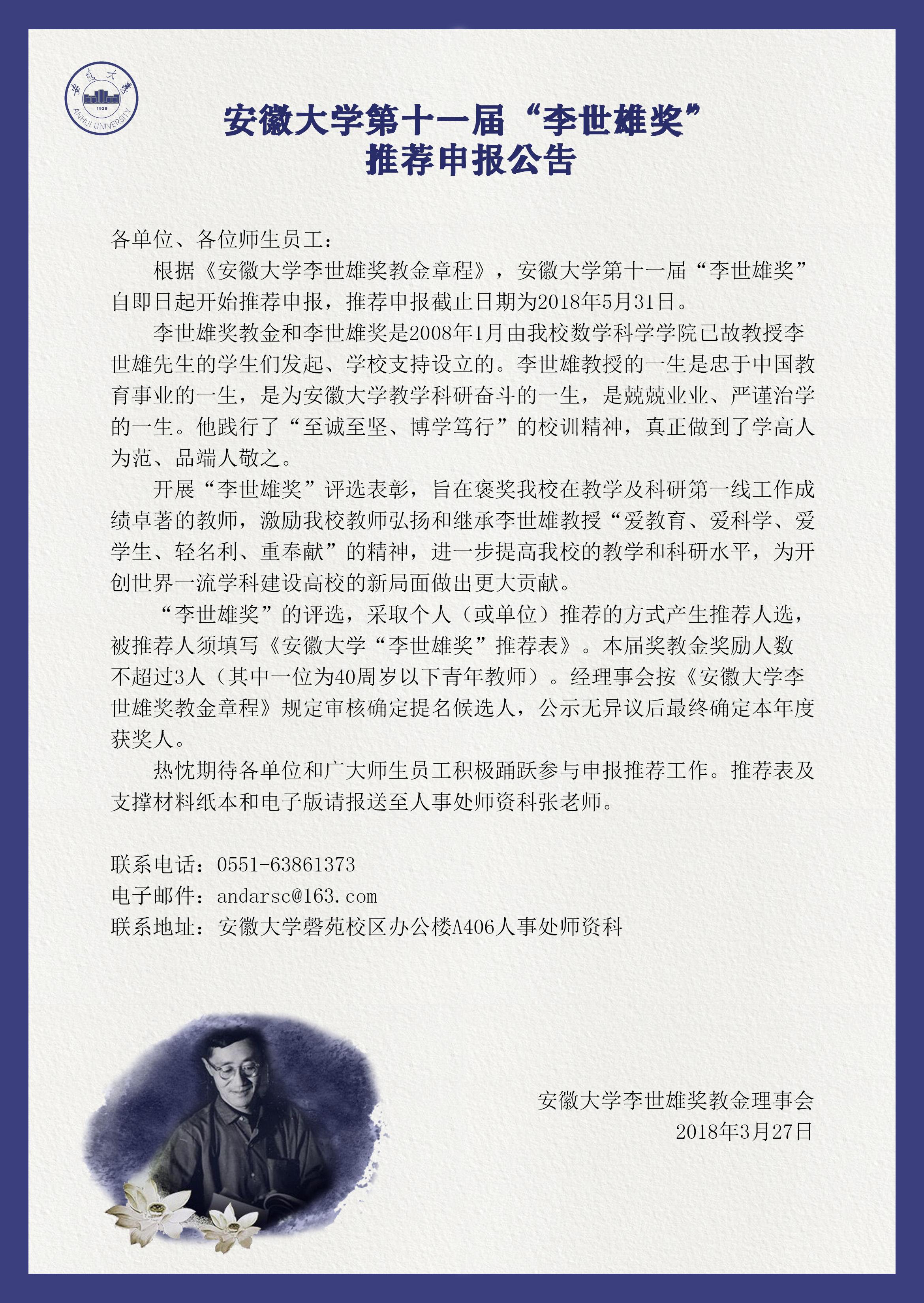 安徽大学第十一届“李世雄奖”推荐申报公告