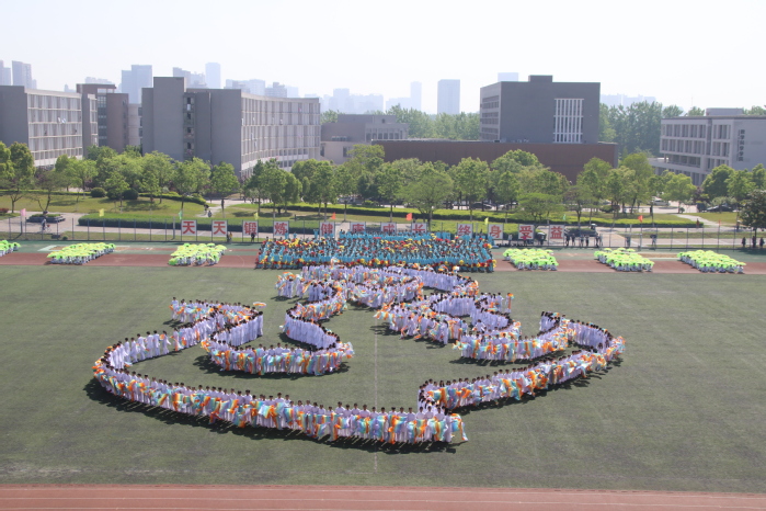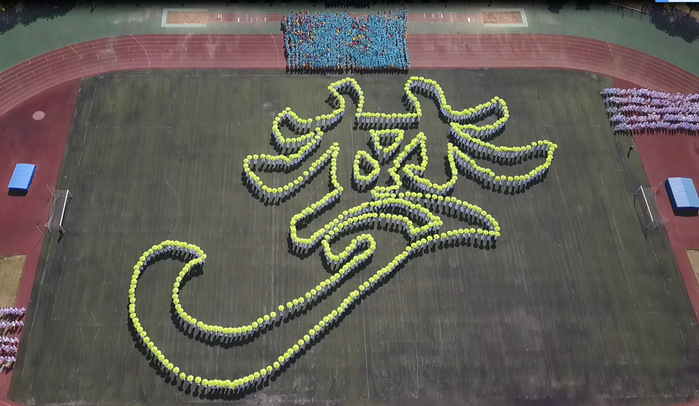 在精彩的航模空中飞行表演后,大型团体操开始了。身着白色衣裳的同学们手持绿伞,如同一块流动的翡翠,形成不同的造型,最后汇聚成“梦”字,寓意新时代中国梦、安大梦。
