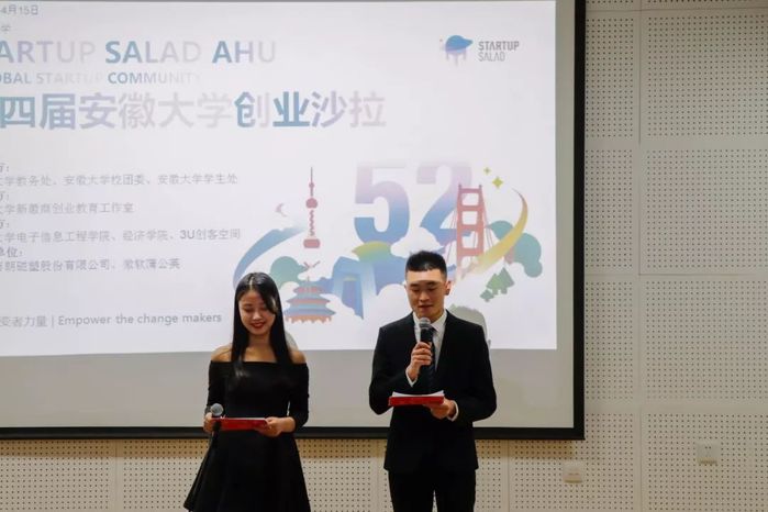 4月15日晚7点,第四届安徽大学创业沙拉在理工A楼一楼报告厅举行。本活动由安徽大学教务处、安徽大学团委、安徽大学学生处主办,安徽大学新徽商创业教育工作室承办,安徽大学电子信息工程学院、经济学院、3U创客空间协办,并受到安徽万朗磁塑股份有限公司、微软蒲公英的支持。