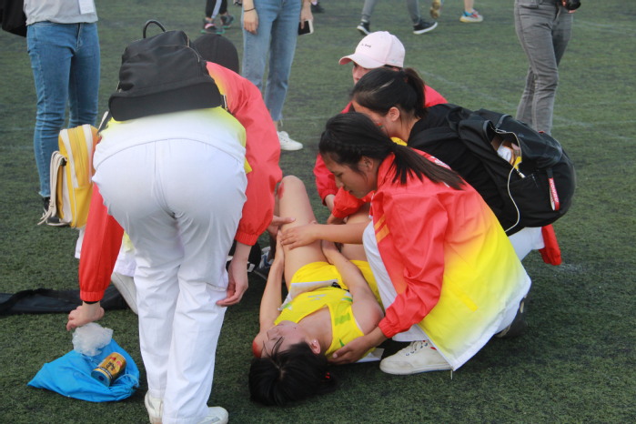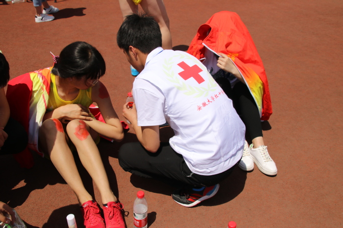 女子100米跑的赛场上,经济学院的一名运动员摔倒了,终点处的红十字会志愿服务队的学生志愿者立即跑过去,为她处理伤口。服务队负责人张嵩说:“我们为本次运动会准备了很多急救药品,之前还专门咨询了专业医护人员使用方法。能为运动员减轻痛苦,这种感觉很棒!”