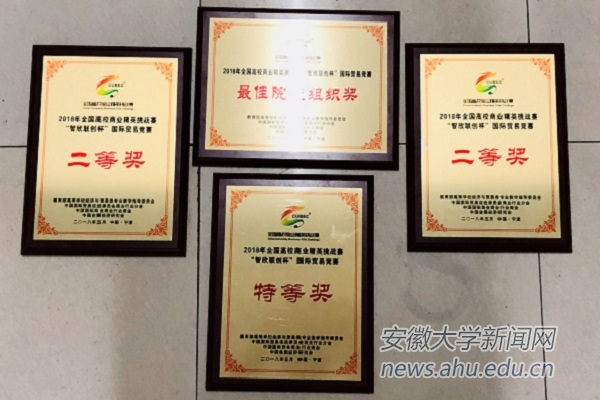 本网讯(新闻中心通讯员 李露露)日前,2018年全国高校商业精英挑战赛国际贸易竞赛暨经贸会展竞赛在宁波举行。我校经济学院师生组成的invincible团队获得特等奖,ACE团队和COWA团队获得二等奖。指导教师马兆良、黄基伟、李保民、邵海燕和吕孝能被评为优秀指导教师。安徽大学获得最佳院校组织奖。