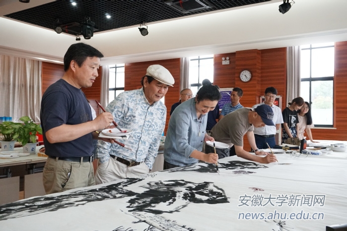 本网讯(新闻中心宋怡然姚佳宁)6月30日,“国内著名画家走进安徽大学”活动在龙河校区举办。校党委书记李仁群出席,徽学与中国传统文化研究院副院长、创作中心主任陈林主持。四川美术学院教授、著名画家梅忠志等七位国内著名的中国画画家共创《磬苑馨香图》,祝贺安大90华诞。