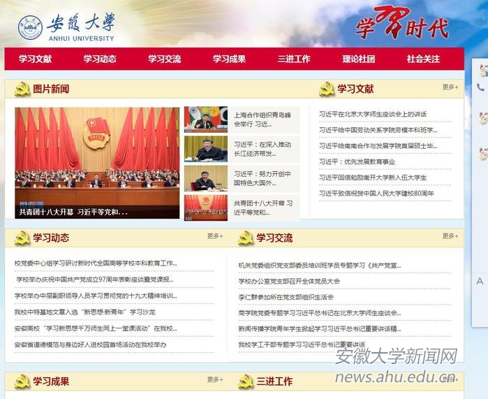 本网讯(宗禾)为深入学习习近平新时代中国特色社会主义思想,党委宣传部、马克思主义学院着力打造了专栏“学习时代”(http://xxsd.ahu.edu.cn/)。7月20日,该专栏随安徽大学新版首页一起正式上线,开启网上“学习时间”。