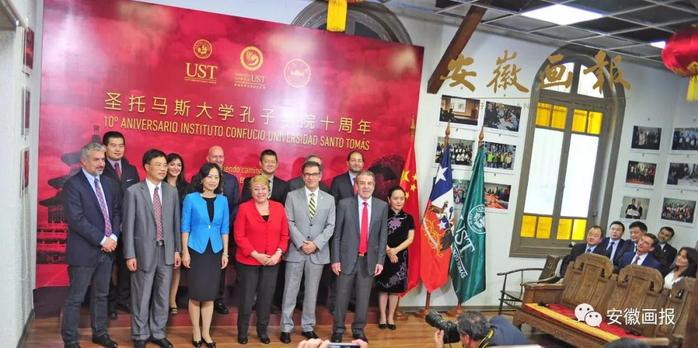 校长匡光力(前排左 2)与智利总统巴切莱特等出席圣托马斯大学孔子学院成立十周年庆典