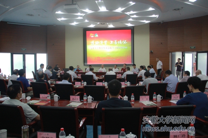 本网讯(宗禾)8月25日下午,安徽大学教育基金会成立十周年座谈会在磬苑校区办公楼B204会议室举行。安徽省委原书记、基金会原名誉理事长卢荣景,安徽省人大常委会原主任、基金会原名誉理事长孟富林,安徽省人大常委会原副主任、基金会原驻会高级顾问吴昌期,安徽省人大常委会原副主任、基金会原高级顾问陈瑞鼎,安徽省人大常委会原副主任、基金会原高级顾问周本立,安徽省政协原副主席、基金会原高级顾问王鹤龄出席座谈会。曾担任基金会理事会领导职务的老同志, 现任基金会理事、监事和捐赠单位代表、学校党政领导等参加座谈会。