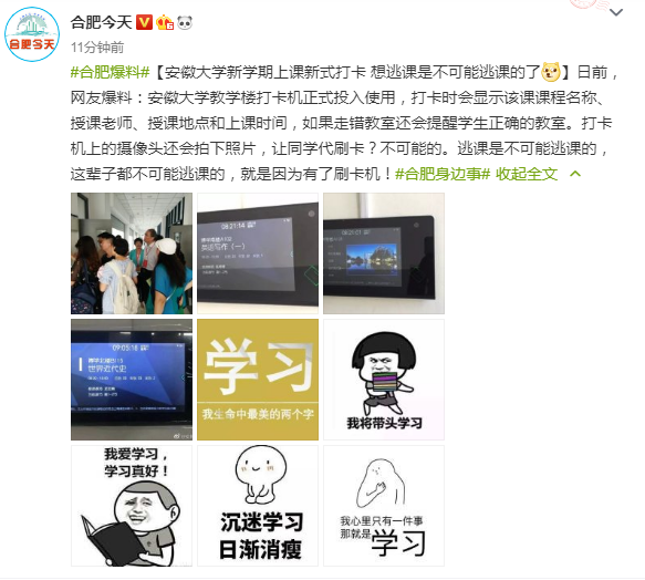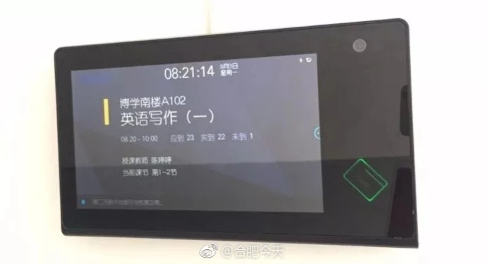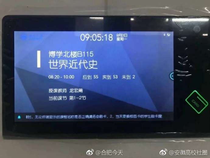 日前,据“合肥今天”微博网友爆料:安徽大学教学楼打卡机正式投入使用,打卡时会显示该课课程名称、授课老师、授课地点和上课时间,如果走错教室还会提醒学生正确的教室。打卡机上的摄像头还会拍下照片。