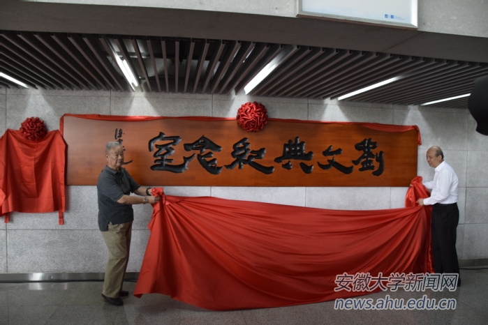 本网讯(新闻中心蒋晶晶张景)9月7日上午,安徽大学刘文典纪念室揭幕暨“九三学社全国传统教育基地”授牌仪式,在磬苑校区文典阁一楼举行。校党委副书记、常务副校长王群京和刘文典先生后人刘平章为刘文典纪念室揭幕,安徽省政协副主席韩军与九三学社中央副主席、九三学社安徽省委主委、中国科学技术大学常务副校长、中国科学院院士潘建伟为“九三学社全国传统教育基地”授牌。校党委副书记、纪委书记胡小松主持,党委常委、副校长虞宝桃、俞本立、薛照明出席。