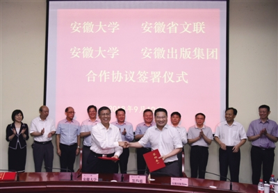 安徽大学党委书记李仁群和安徽出版集团党委书记、董事长王民代表双方签订合作协议,省委常委、宣传部长虞爱华等见证签约仪式
