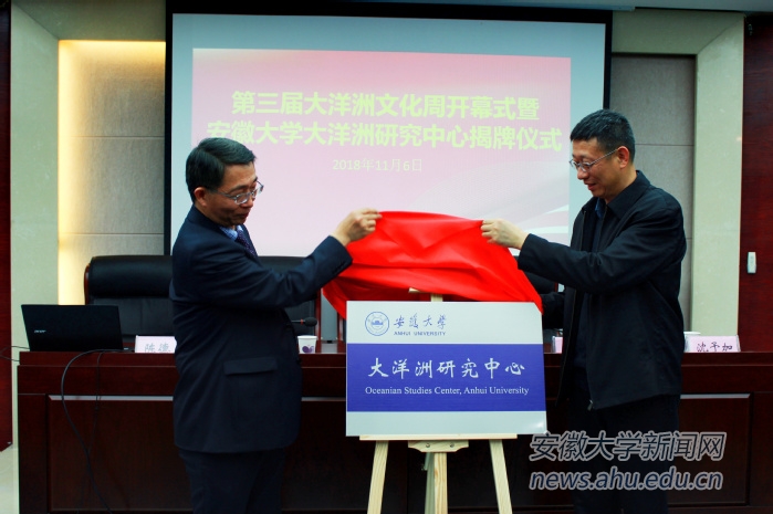 本网讯(新闻中心杨越王晗颖)11月6日下午,第三届大洋洲文化周开幕式暨安徽大学大洋洲研究中心揭牌仪式在我校人文楼C310举行。校党委副书记、纪委书记胡小松,澳大利亚西悉尼澳中艺术与文化研究院院长王腊宝教授,一同为安徽大学大洋洲研究中心揭牌并为开幕式致辞。