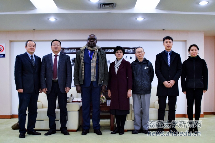 程雁雷向斯特凡·恩格瓦扎一行介绍了我校以及外语学院的基本情况,她说,外语学院作为安徽大学最早成立的院系之一,多年来培养了大量优秀的专业及复合型人才;法语专业始建于1974年,为社会培养了大量的专业人才,受到用人单位的广泛好评。另外,她强调,安徽大学主动响应国家“一带一路”倡议,与国外高校广泛交流,目前已与智利圣托马斯大学、乌克兰哈尔科夫国立大学、阿塞拜疆巴库国立大学合作设立了3所孔子学院,并与安徽省人民政府外事办公室合作共建了“国别和区域研究院”。程雁雷表示,安徽大学在读留学生中,有来自非洲28个国家的73位同学,中非双方在教育上将会进行更加深入持久的合作。