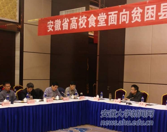 本网讯(后勤管理处 郭子哨)为了认真贯彻《安徽省人民政府办公厅关于引导支持高校食堂面向贫困县采购农产品的意见》(皖政办【2017】299号),进一步推进“面向采购”工作,2018年11月20日,省教育厅、省扶贫办在阜阳市主持召开了“安徽省高校食堂面向贫困县采购农产品调研座谈会”。阜阳市副市长王显义、省教育厅高校后勤管理中心主任陈鹏、省扶贫办社会扶贫处处长张文出席会议,阜阳市所辖八个贫困县(区)负责人、30余所高校分管领导和部门负责人和有关企业代表参加会议,我校党委常委、副校长虞宝桃出席会议并讲话。