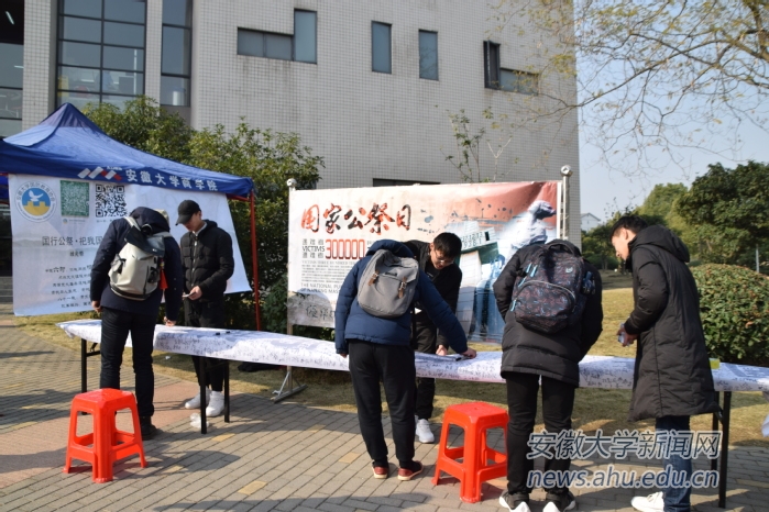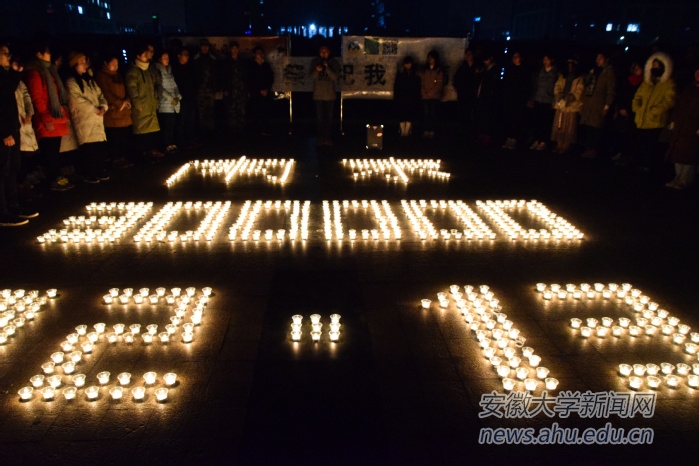 我校国防教育协会、社会与政治学院等单位举办了一系列“缅怀先烈遗志 勿忘南京国耻”纪念活动。我校师生积极在条幅上签名,并在留言板上写下自己对逝者的缅怀和历史感想。当日晚,同学们聚集到鸣磬广场,点燃“南京”、“300000”、“12.13”字样的蜡烛,并进行主题演讲、祭文朗诵和一分钟默哀仪式。