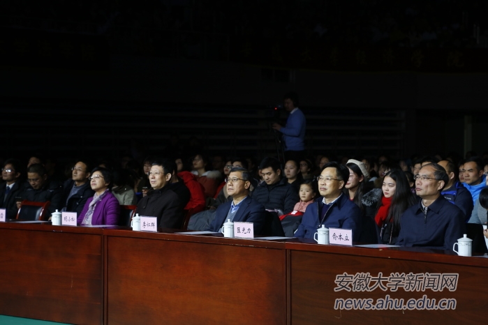 本网讯(新闻中心 宋怡然 姚家宁 朱小曼)南湖星火耀八荒,天安丽日盈晖光。改革四秩风云起,宏伟蓝图谱新章。辞旧迎新,祈福纳瑞,万物复苏,大地回春,12月28日晚,以“向阳花开万木春”为主题的安徽大学第26届文化艺术节汇报演出暨2019迎新年晚会在磬苑校区体育馆举行。校党委书记李仁群,校长匡光力,党委副书记、纪委书记胡小松,副校长俞本立、程雁雷出席晚会。