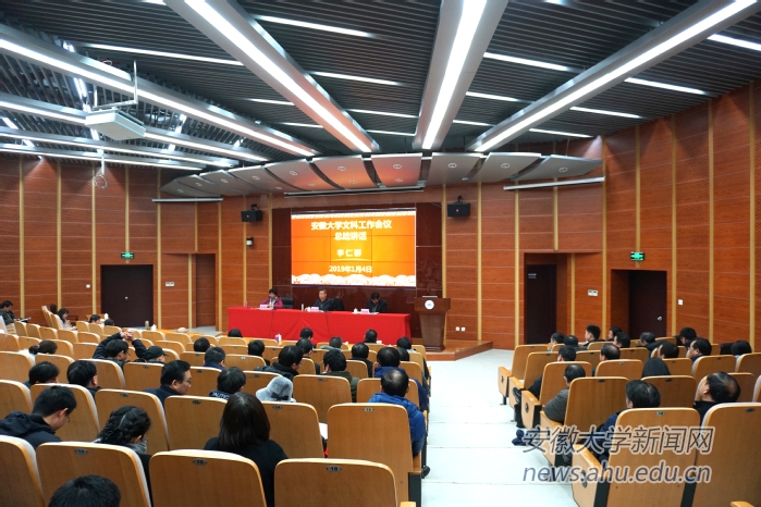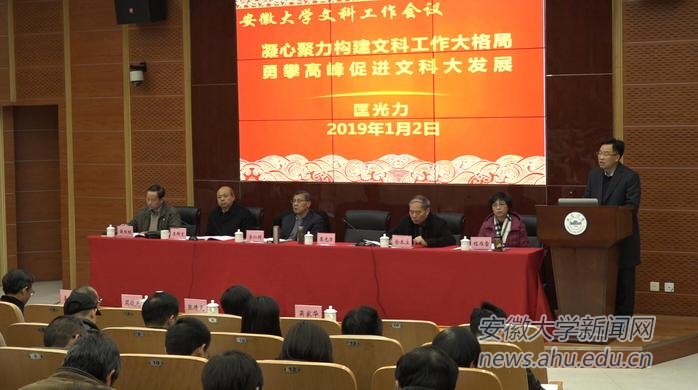 本网讯(新闻中心 徐红 宋慕妍 侯玉娜 陈雪)1月2日至4日,安徽大学文科工作会议在磬苑校区举行。这次文科盛会是在全校上下深入学习贯彻习近平新时代中国特色社会主义思想特别是习近平总书记关于教育的重要论述,关于哲学社会科学的重要论述和全国教育大会精神,贯彻落实教育部关于高等学校加快双一流建设的指导意见和全国高校哲学社会科学科研工作会议会议精神的新形势下召开的。会议提出凝心聚力,构建文科工作大格局,开创我校哲学社会科学工作新局面;勇攀高峰,促进文科大发展,深入推进我校“双一流”建设。校党委书记李仁群,校长匡光力,校党委副书记、常务副校长王群京,副校长虞宝桃,副校长俞本立,副校长薛照明,副校长程雁雷出席会议。